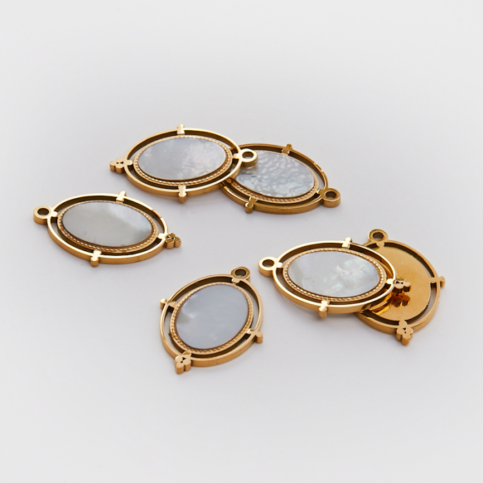 Zawieszka ze stali chirurgicznej owal z masą perłową w kolorze złotym 16mm PVDTo estetyczny element biżuteryjny ze stali chirurgicznej 316L, chętnie wybierany do nowoczesnych projektów. To materiał chętnie wybierany do biżuterii handmade ze względu na trwałość, estetykę i wygodę użytkowania. Wykończenie w kolorze złotym uzyskane metodą PVD.Zawieszka ze stali chirurgicznej 316L to dekoracyjny element, który nadaje biżuterii charakteru i pozwala tworzyć spersonalizowane projekty. Świetnie sprawdza się w naszyjnikach, bransoletkach, kolczykach oraz drobnych charmsach.Forma lub motyw