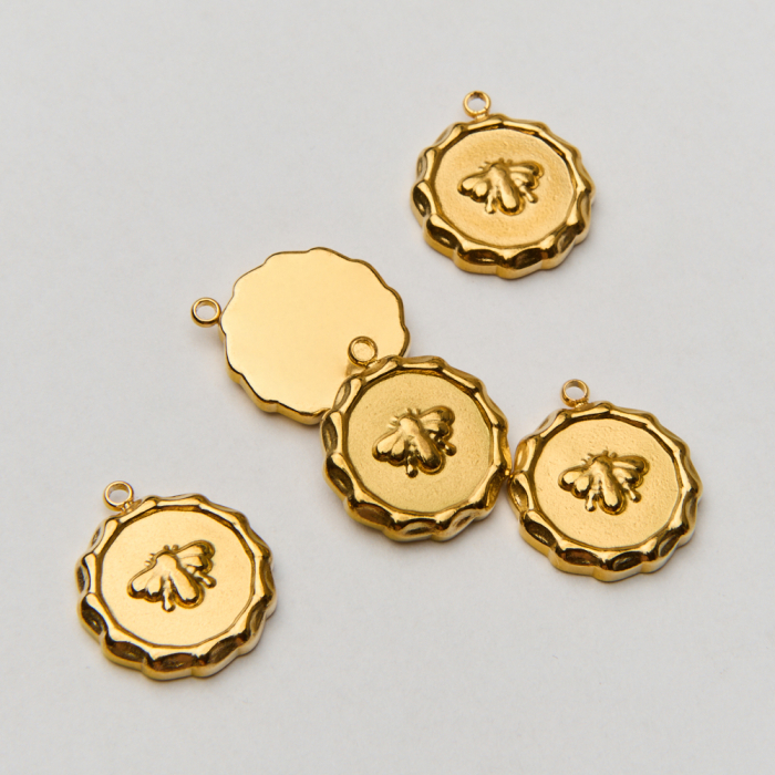 Zawieszka ze stali chirurgicznej ozdobne kółko z ćmą w kolorze złotym 15mm PVDTo starannie wykonany produkt ze stali chirurgicznej 316L, który dobrze prezentuje się w codziennym użytkowaniu. Stal chirurgiczna 316L jest ceniona za odporność na korozję i estetyczny wygląd w codziennym użytkowaniu. Wykończenie w kolorze złotym uzyskane metodą PVD.Zawieszka ze stali chirurgicznej 316L to dekoracyjny element, który nadaje biżuterii charakteru i pozwala tworzyć spersonalizowane projekty. Świetnie sprawdza się w naszyjnikach, bransoletkach, kolczykach oraz drobnych charmsach.Forma lub motyw