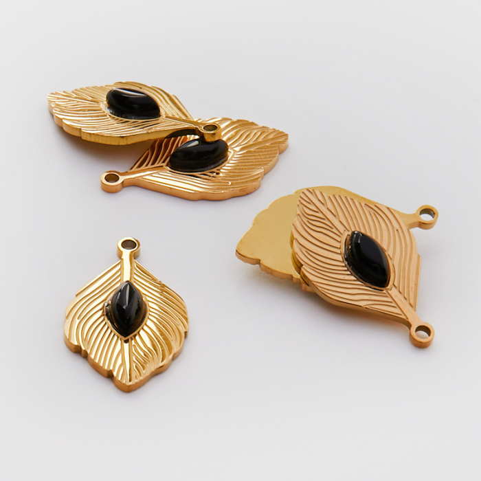 Zawieszka ze stali chirurgicznej pawie pióro z onyksem w kolorze złotym 26mm PVDTo estetyczny element biżuteryjny ze stali chirurgicznej 316L, chętnie wybierany do nowoczesnych projektów. W biżuterii handmade stal chirurgiczna 316L jest ceniona za dobry wygląd, odporność na korozję i wygodę codziennego użytkowania. Wykończenie w kolorze złotym uzyskane metodą PVD.Zawieszka ze stali chirurgicznej 316L to dekoracyjny element, który nadaje biżuterii charakteru i pozwala tworzyć spersonalizowane projekty. Świetnie sprawdza się w naszyjnikach, bransoletkach, kolczykach oraz drobnych charmsach.Forma lub motyw