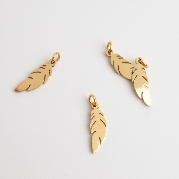 Zawieszka ze stali chirurgicznej piórko w kolorze złotym 13,5mmTo starannie wykonany produkt ze stali szlachetnej, który dobrze prezentuje się w codziennym użytkowaniu. W biżuterii handmade stal szlachetna jest ceniona za dobry wygląd, odporność na korozję i wygodę codziennego użytkowania.Zawieszka ze stali szlachetnej to dekoracyjny element, który nadaje biżuterii charakteru i pozwala tworzyć spersonalizowane projekty. Świetnie sprawdza się w naszyjnikach, bransoletkach, kolczykach oraz drobnych charmsach.Forma lub motyw
