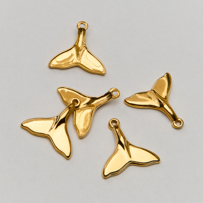 Zawieszka ze stali chirurgicznej płetwa wieloryba w kolorze złotym 18mm PVDTo starannie wykonany produkt ze stali chirurgicznej 316L, który dobrze prezentuje się w codziennym użytkowaniu. W biżuterii handmade stal chirurgiczna 316L jest ceniona za dobry wygląd, odporność na korozję i wygodę codziennego użytkowania. Wykończenie w kolorze złotym uzyskane metodą PVD.Zawieszka ze stali chirurgicznej 316L to dekoracyjny element, który nadaje biżuterii charakteru i pozwala tworzyć spersonalizowane projekty. Świetnie sprawdza się w naszyjnikach, bransoletkach, kolczykach oraz drobnych charmsach.Forma lub motyw