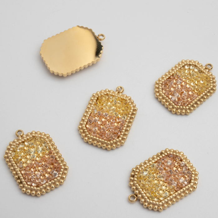 Zawieszka ze stali chirurgicznej prostokąt wysadzany cyrkoniami w kolorze złotym 21mm PVDTo trwały element biżuterii lub półfabrykat jubilerski, który dobrze sprawdza się w codziennych realizacjach. W biżuterii handmade stal chirurgiczna 316L jest ceniona za dobry wygląd, odporność na korozję i wygodę codziennego użytkowania. Wykończenie w kolorze złotym uzyskane metodą PVD.Zawieszka ze stali chirurgicznej 316L to dekoracyjny element, który nadaje biżuterii charakteru i pozwala tworzyć spersonalizowane projekty. Świetnie sprawdza się w naszyjnikach, bransoletkach, kolczykach oraz drobnych charmsach.Forma lub motyw