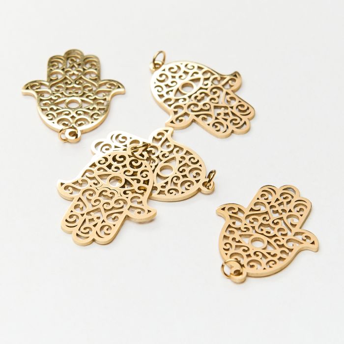 Zawieszka ze stali chirurgicznej ręka fatimy ażurowa do naszyjników w kolorze złotym 26mm PVD