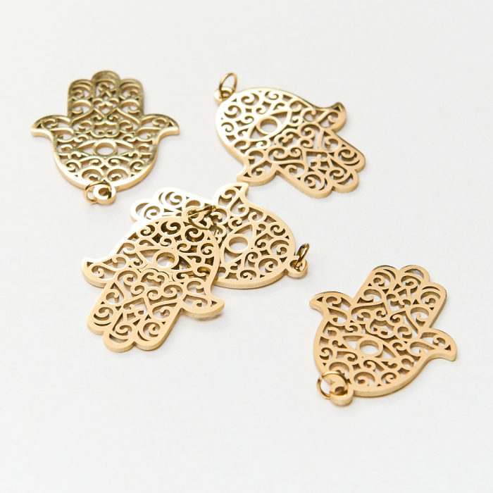 Zawieszka ze stali chirurgicznej ręka fatimy ażurowa do naszyjników w kolorze złotym 26mm PVDTo trwały element biżuterii lub półfabrykat jubilerski, który dobrze sprawdza się w codziennych realizacjach. To materiał chętnie wybierany do biżuterii handmade ze względu na trwałość, estetykę i wygodę użytkowania. Wykończenie w kolorze złotym uzyskane metodą PVD.Naszyjnik ze stali chirurgicznej 316L to gotowy element biżuterii lub baza do dalszego personalizowania, w zależności od konstrukcji produktu. Dobrze sprawdza się w codziennym noszeniu i pozwala łatwo dopasować styl projektu do pozostałych dodatków.Rozmiar