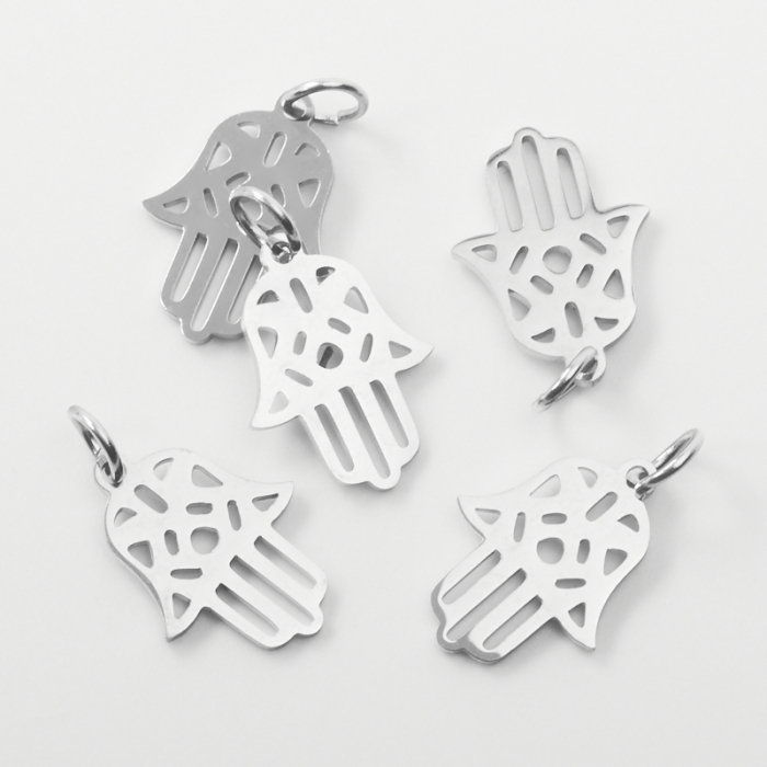 Zawieszka ze stali chirurgicznej ręka fatimy w kolorze srebrnym 15,5mmTo trwały element biżuterii lub półfabrykat jubilerski, który dobrze sprawdza się w codziennych realizacjach. To materiał chętnie wybierany do biżuterii handmade ze względu na trwałość, estetykę i wygodę użytkowania.Zawieszka ze stali szlachetnej to dekoracyjny element, który nadaje biżuterii charakteru i pozwala tworzyć spersonalizowane projekty. Świetnie sprawdza się w naszyjnikach, bransoletkach, kolczykach oraz drobnych charmsach.Forma lub motyw