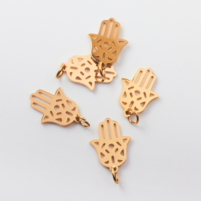 Zawieszka ze stali chirurgicznej ręka fatimy w kolorze złotym 17mmTo dopracowany produkt ze stali chirurgicznej 316L, który łączy praktyczność z estetycznym wyglądem. To materiał chętnie wybierany do biżuterii handmade ze względu na trwałość, estetykę i wygodę użytkowania.Zawieszka ze stali chirurgicznej 316L to dekoracyjny element, który nadaje biżuterii charakteru i pozwala tworzyć spersonalizowane projekty. Świetnie sprawdza się w naszyjnikach, bransoletkach, kolczykach oraz drobnych charmsach.Forma lub motyw