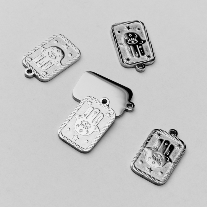 Zawieszka ze stali chirurgicznej ręka Fatimy w prostokącie w kolorze srebrnym 17mmTo estetyczny element biżuteryjny ze stali chirurgicznej 316L, chętnie wybierany do nowoczesnych projektów. Stal chirurgiczna 316L dobrze sprawdza się w biżuterii noszonej na co dzień, ponieważ łączy trwałość z estetycznym wykończeniem.Zawieszka ze stali chirurgicznej 316L to dekoracyjny element, który nadaje biżuterii charakteru i pozwala tworzyć spersonalizowane projekty. Świetnie sprawdza się w naszyjnikach, bransoletkach, kolczykach oraz drobnych charmsach.Forma lub motyw