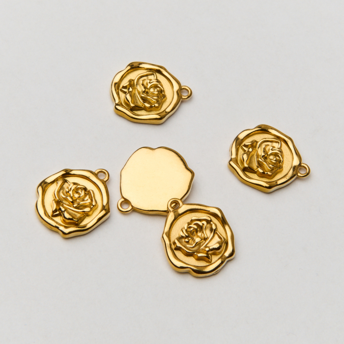 Zawieszka ze stali chirurgicznej róża w kolorze złotym 14mm PVDTo estetyczny element biżuteryjny ze stali chirurgicznej 316L, chętnie wybierany do nowoczesnych projektów. Stal chirurgiczna 316L dobrze sprawdza się w biżuterii noszonej na co dzień, ponieważ łączy trwałość z estetycznym wykończeniem. Wykończenie w kolorze złotym uzyskane metodą PVD.Zawieszka ze stali chirurgicznej 316L to dekoracyjny element, który nadaje biżuterii charakteru i pozwala tworzyć spersonalizowane projekty. Świetnie sprawdza się w naszyjnikach, bransoletkach, kolczykach oraz drobnych charmsach.Forma lub motyw