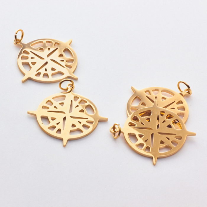 Zawieszka ze stali chirurgicznej róża wiatrów do naszyjników w kolorze złotym 29mm PVDTo starannie wykonany produkt ze stali chirurgicznej 316L, który dobrze prezentuje się w codziennym użytkowaniu. W biżuterii handmade stal chirurgiczna 316L jest ceniona za dobry wygląd, odporność na korozję i wygodę codziennego użytkowania. Wykończenie w kolorze złotym uzyskane metodą PVD.Naszyjnik ze stali chirurgicznej 316L to gotowy element biżuterii lub baza do dalszego personalizowania, w zależności od konstrukcji produktu. Dobrze sprawdza się w codziennym noszeniu i pozwala łatwo dopasować styl projektu do pozostałych dodatków.Rozmiar