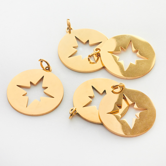 Zawieszka ze stali chirurgicznej róża wiatrów w kółku w kolorze złotym 20mmTo dopracowany produkt ze stali chirurgicznej 316L, który łączy praktyczność z estetycznym wyglądem. Stal chirurgiczna 316L dobrze sprawdza się w biżuterii noszonej na co dzień, ponieważ łączy trwałość z estetycznym wykończeniem.Zawieszka ze stali chirurgicznej 316L to dekoracyjny element, który nadaje biżuterii charakteru i pozwala tworzyć spersonalizowane projekty. Świetnie sprawdza się w naszyjnikach, bransoletkach, kolczykach oraz drobnych charmsach.Forma lub motyw