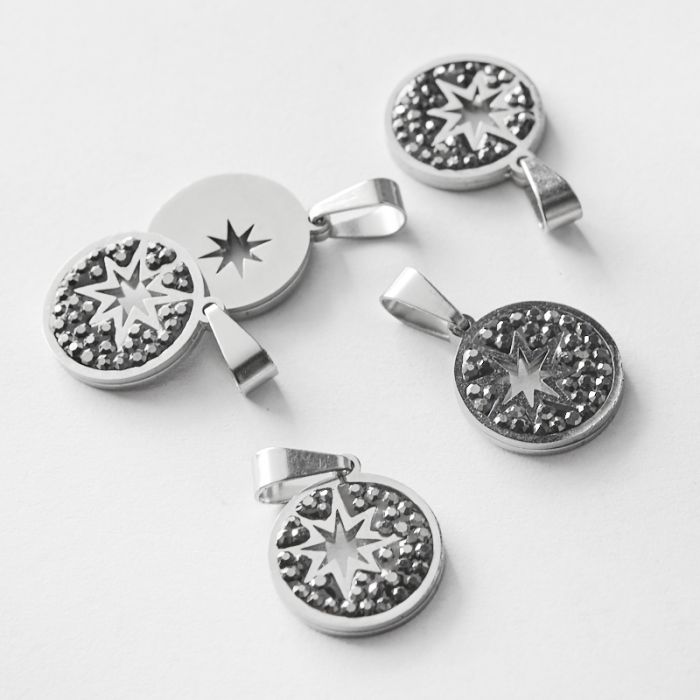Zawieszka ze stali chirurgicznej róża wiatrów wysadzana cyrkoniami w kolorze srebrnym 14mm