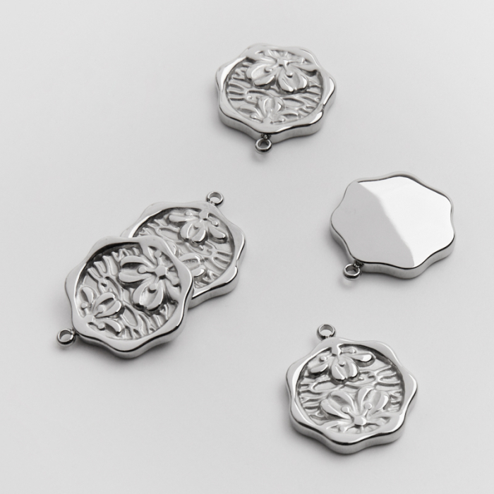 Zawieszka ze stali chirurgicznej siedmiobok z kwiatkami w kolorze srebrnym 16mmTo estetyczny element biżuteryjny ze stali chirurgicznej 316L, chętnie wybierany do nowoczesnych projektów. Stal chirurgiczna 316L dobrze sprawdza się w biżuterii noszonej na co dzień, ponieważ łączy trwałość z estetycznym wykończeniem.Zawieszka ze stali chirurgicznej 316L to dekoracyjny element, który nadaje biżuterii charakteru i pozwala tworzyć spersonalizowane projekty. Świetnie sprawdza się w naszyjnikach, bransoletkach, kolczykach oraz drobnych charmsach.Forma lub motyw