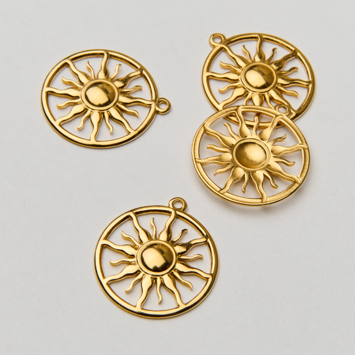Zawieszka ze stali chirurgicznej słońce w kole w kolorze złotym 24mm PVDTo estetyczny element biżuteryjny ze stali chirurgicznej 316L, chętnie wybierany do nowoczesnych projektów. W biżuterii handmade stal chirurgiczna 316L jest ceniona za dobry wygląd, odporność na korozję i wygodę codziennego użytkowania. Wykończenie w kolorze złotym uzyskane metodą PVD.Zawieszka ze stali chirurgicznej 316L to dekoracyjny element, który nadaje biżuterii charakteru i pozwala tworzyć spersonalizowane projekty. Świetnie sprawdza się w naszyjnikach, bransoletkach, kolczykach oraz drobnych charmsach.Forma lub motyw