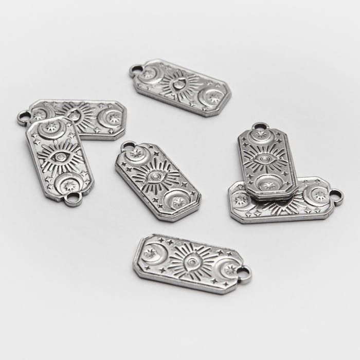 Zawieszka ze stali chirurgicznej słońce z księżycem w kolorze srebrnym 17mmTo trwały element biżuterii lub półfabrykat jubilerski, który dobrze sprawdza się w codziennych realizacjach. To materiał chętnie wybierany do biżuterii handmade ze względu na trwałość, estetykę i wygodę użytkowania.Zawieszka ze stali szlachetnej to dekoracyjny element, który nadaje biżuterii charakteru i pozwala tworzyć spersonalizowane projekty. Świetnie sprawdza się w naszyjnikach, bransoletkach, kolczykach oraz drobnych charmsach.Forma lub motyw