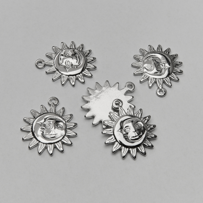 Zawieszka ze stali chirurgicznej słońce z księżycem w kolorze srebrnym 24mmTo estetyczny element biżuteryjny ze stali chirurgicznej 316L, chętnie wybierany do nowoczesnych projektów. To materiał chętnie wybierany do biżuterii handmade ze względu na trwałość, estetykę i wygodę użytkowania.Zawieszka ze stali chirurgicznej 316L to dekoracyjny element, który nadaje biżuterii charakteru i pozwala tworzyć spersonalizowane projekty. Świetnie sprawdza się w naszyjnikach, bransoletkach, kolczykach oraz drobnych charmsach.Forma lub motyw