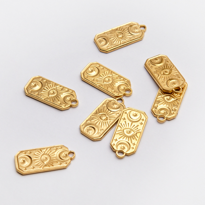 Zawieszka ze stali chirurgicznej słońce z księżycem w kolorze złotym 17mmTo trwały element biżuterii lub półfabrykat jubilerski, który dobrze sprawdza się w codziennych realizacjach. Stal chirurgiczna 316L dobrze sprawdza się w biżuterii noszonej na co dzień, ponieważ łączy trwałość z estetycznym wykończeniem.Zawieszka ze stali chirurgicznej 316L to dekoracyjny element, który nadaje biżuterii charakteru i pozwala tworzyć spersonalizowane projekty. Świetnie sprawdza się w naszyjnikach, bransoletkach, kolczykach oraz drobnych charmsach.Forma lub motyw