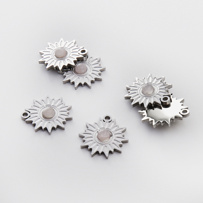 Zawieszka ze stali chirurgicznej słoneczko różowym kryształem górskim w kolorze srebrnym 17mmTo dopracowany produkt ze stali chirurgicznej 316L, który łączy praktyczność z estetycznym wyglądem. To materiał chętnie wybierany do biżuterii handmade ze względu na trwałość, estetykę i wygodę użytkowania.Zawieszka ze stali chirurgicznej 316L to dekoracyjny element, który nadaje biżuterii charakteru i pozwala tworzyć spersonalizowane projekty. Świetnie sprawdza się w naszyjnikach, bransoletkach, kolczykach oraz drobnych charmsach.Forma lub motyw