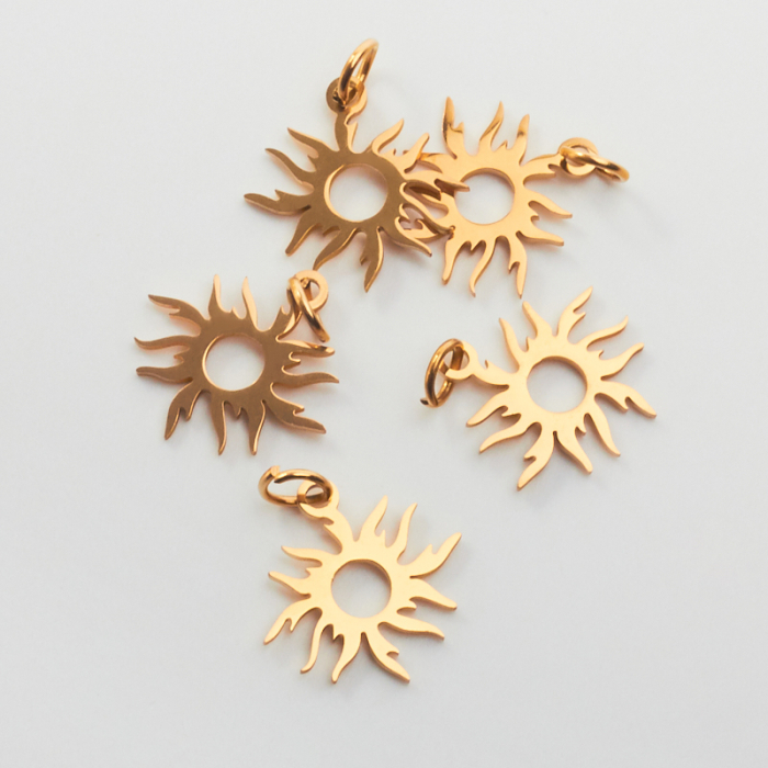 Zawieszka ze stali chirurgicznej słoneczko wycięte w kolorze złotym 14mm PVDTo dopracowany produkt ze stali chirurgicznej 316L, który łączy praktyczność z estetycznym wyglądem. W biżuterii handmade stal chirurgiczna 316L jest ceniona za dobry wygląd, odporność na korozję i wygodę codziennego użytkowania. Wykończenie w kolorze złotym uzyskane metodą PVD.Zawieszka ze stali chirurgicznej 316L to dekoracyjny element, który nadaje biżuterii charakteru i pozwala tworzyć spersonalizowane projekty. Świetnie sprawdza się w naszyjnikach, bransoletkach, kolczykach oraz drobnych charmsach.Forma lub motyw