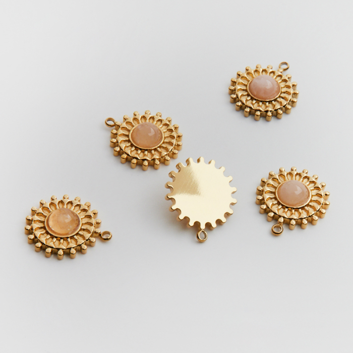 Zawieszka ze stali chirurgicznej słoneczko z kryształem górskim w kolorze złotym 17,5mm PVDTo estetyczny element biżuteryjny ze stali chirurgicznej 316L, chętnie wybierany do nowoczesnych projektów. Stal chirurgiczna 316L jest ceniona za odporność na korozję i estetyczny wygląd w codziennym użytkowaniu. Wykończenie w kolorze złotym uzyskane metodą PVD.Zawieszka ze stali chirurgicznej 316L to dekoracyjny element, który nadaje biżuterii charakteru i pozwala tworzyć spersonalizowane projekty. Świetnie sprawdza się w naszyjnikach, bransoletkach, kolczykach oraz drobnych charmsach.Forma lub motyw