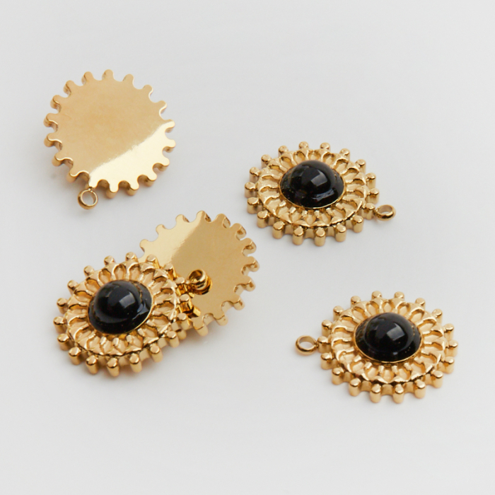 Zawieszka ze stali chirurgicznej słoneczko z onyksem w kolorze złotym 17,5mm PVDTo estetyczny element biżuteryjny ze stali chirurgicznej 316L, chętnie wybierany do nowoczesnych projektów. Stal chirurgiczna 316L dobrze sprawdza się w biżuterii noszonej na co dzień, ponieważ łączy trwałość z estetycznym wykończeniem. Wykończenie w kolorze złotym uzyskane metodą PVD.Zawieszka ze stali chirurgicznej 316L to dekoracyjny element, który nadaje biżuterii charakteru i pozwala tworzyć spersonalizowane projekty. Świetnie sprawdza się w naszyjnikach, bransoletkach, kolczykach oraz drobnych charmsach.Forma lub motyw