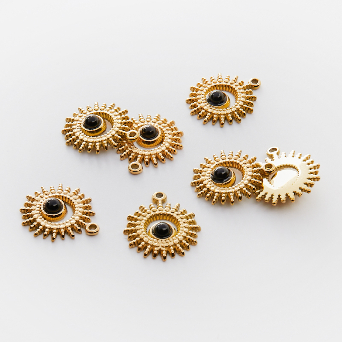 Zawieszka ze stali chirurgicznej słoneczko z onyksem w kolorze złotym 20,5mm PVDTo estetyczny element biżuteryjny ze stali chirurgicznej 316L, chętnie wybierany do nowoczesnych projektów. To materiał chętnie wybierany do biżuterii handmade ze względu na trwałość, estetykę i wygodę użytkowania. Wykończenie w kolorze złotym uzyskane metodą PVD.Zawieszka ze stali chirurgicznej 316L to dekoracyjny element, który nadaje biżuterii charakteru i pozwala tworzyć spersonalizowane projekty. Świetnie sprawdza się w naszyjnikach, bransoletkach, kolczykach oraz drobnych charmsach.Forma lub motyw