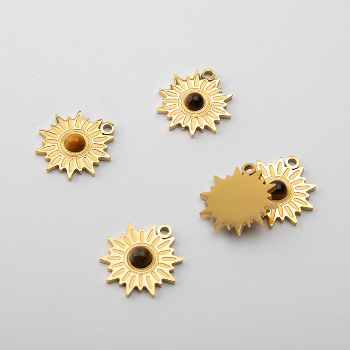 Zawieszka ze stali chirurgicznej słoneczko z tygrysim okiem w kolorze złotym 17mm PVDTo dopracowany produkt ze stali chirurgicznej 316L, który łączy praktyczność z estetycznym wyglądem. Stal chirurgiczna 316L dobrze sprawdza się w biżuterii noszonej na co dzień, ponieważ łączy trwałość z estetycznym wykończeniem. Wykończenie w kolorze złotym uzyskane metodą PVD.Zawieszka ze stali chirurgicznej 316L to dekoracyjny element, który nadaje biżuterii charakteru i pozwala tworzyć spersonalizowane projekty. Świetnie sprawdza się w naszyjnikach, bransoletkach, kolczykach oraz drobnych charmsach.Forma lub motyw