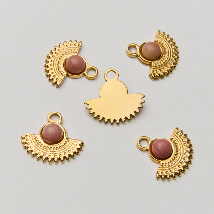Zawieszka ze stali chirurgicznej wachlarz z rodonitem w kolorze złotym 17mm PVDTo dopracowany produkt ze stali chirurgicznej 316L, który łączy praktyczność z estetycznym wyglądem. W biżuterii handmade stal chirurgiczna 316L jest ceniona za dobry wygląd, odporność na korozję i wygodę codziennego użytkowania. Wykończenie w kolorze złotym uzyskane metodą PVD.Zawieszka ze stali chirurgicznej 316L to dekoracyjny element, który nadaje biżuterii charakteru i pozwala tworzyć spersonalizowane projekty. Świetnie sprawdza się w naszyjnikach, bransoletkach, kolczykach oraz drobnych charmsach.Forma lub motyw