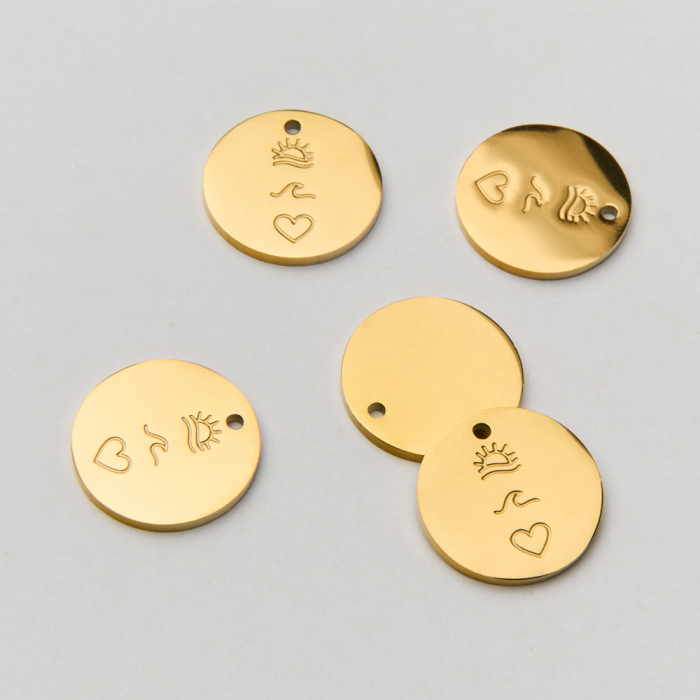 Zawieszka ze stali chirurgicznej z delikatnym grawerem słońca, fali i miłości w kolorze złotym 15mm PVDTo trwały element biżuterii lub półfabrykat jubilerski, który dobrze sprawdza się w codziennych realizacjach. Stal szlachetna dobrze sprawdza się w biżuterii noszonej na co dzień, ponieważ łączy trwałość z estetycznym wykończeniem. Wykończenie w kolorze złotym uzyskane metodą PVD.Zawieszka ze stali szlachetnej to dekoracyjny element, który nadaje biżuterii charakteru i pozwala tworzyć spersonalizowane projekty. Świetnie sprawdza się w naszyjnikach, bransoletkach, kolczykach oraz drobnych charmsach.Forma lub motyw