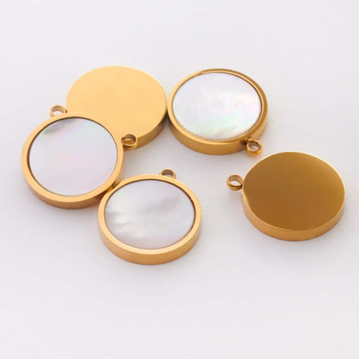 Zawieszka ze stali chirurgicznej z masą perłową kółko w kolorze złotym 11,5mmTo estetyczny element biżuteryjny ze stali chirurgicznej 316L, chętnie wybierany do nowoczesnych projektów. To materiał chętnie wybierany do biżuterii handmade ze względu na trwałość, estetykę i wygodę użytkowania.Zawieszka ze stali chirurgicznej 316L to dekoracyjny element, który nadaje biżuterii charakteru i pozwala tworzyć spersonalizowane projekty. Świetnie sprawdza się w naszyjnikach, bransoletkach, kolczykach oraz drobnych charmsach.Forma lub motyw
