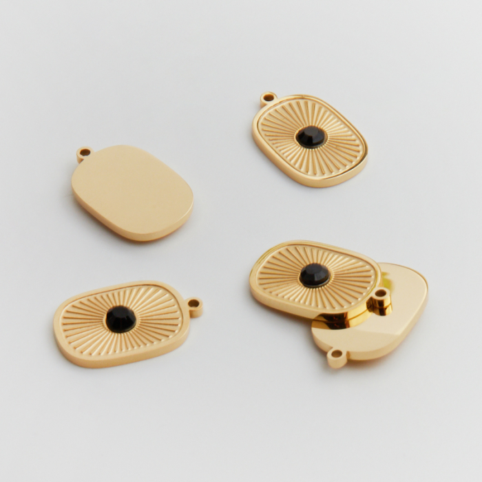 Zawieszka ze stali chirurgicznej zaokrąglony prostokąt z czarną cyrkonią w kolorze złotym 18mm PVDTo trwały element biżuterii lub półfabrykat jubilerski, który dobrze sprawdza się w codziennych realizacjach. Stal chirurgiczna 316L dobrze sprawdza się w biżuterii noszonej na co dzień, ponieważ łączy trwałość z estetycznym wykończeniem. Wykończenie w kolorze złotym uzyskane metodą PVD.Zawieszka ze stali chirurgicznej 316L to dekoracyjny element, który nadaje biżuterii charakteru i pozwala tworzyć spersonalizowane projekty. Świetnie sprawdza się w naszyjnikach, bransoletkach, kolczykach oraz drobnych charmsach.Forma lub motyw