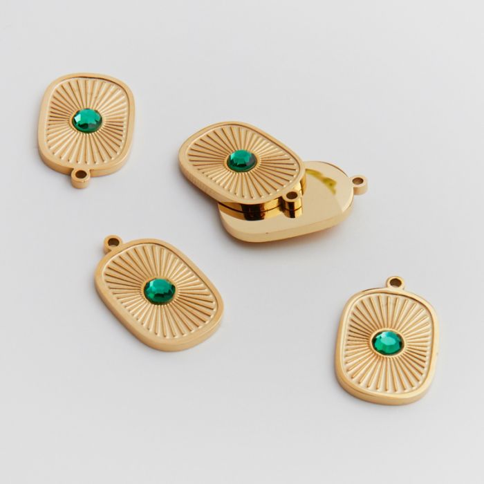 Zawieszka ze stali chirurgicznej zaokrąglony prostokąt z zieloną cyrkonią w kolorze złotym 18mm PVD