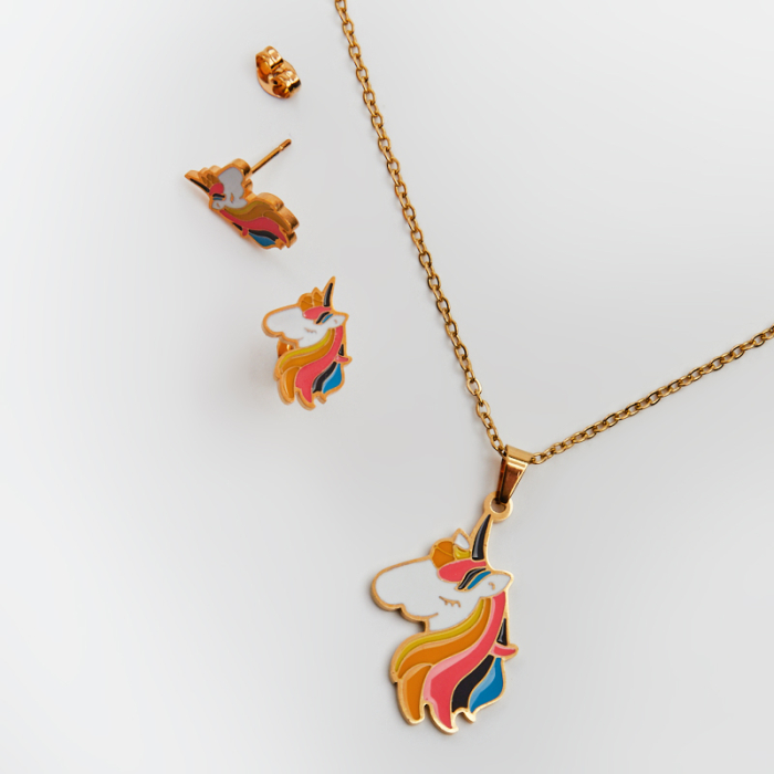 Zestaw dziecięcy naszyjnik z kolczykami ze stali chirurgicznej jednorożec w kolorze złotym 45cmTo trwały element biżuterii lub półfabrykat jubilerski, który dobrze sprawdza się w codziennych realizacjach. Stal chirurgiczna 316L jest ceniona za odporność na korozję i estetyczny wygląd w codziennym użytkowaniu.Komplet biżuterii ze stali chirurgicznej 316L to spójnie zaprojektowany zestaw, który łączy estetykę z wygodą codziennego użytkowania. Dzięki dopasowanym elementom dobrze prezentuje się jako gotowa biżuteria i ułatwia stworzenie harmonijnej stylizacji.Rozmiar