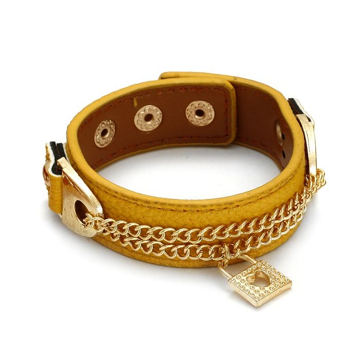 Żółta bransoletka kłódeczka na rzemieniu z łańcuszkami 18-21cm